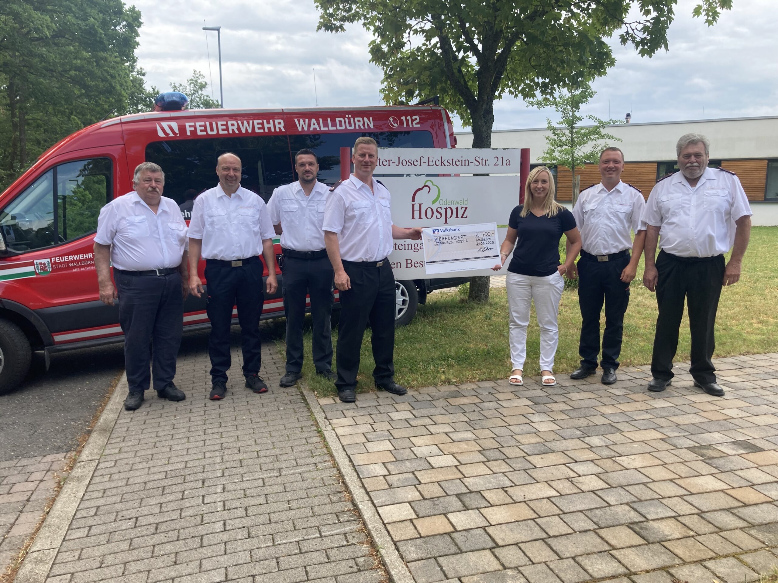 Gemeinsam mit weiteren Vertretern der Feuerwehr übergab Abteilungskommandant Holger Deuser den symbolischen Spendenscheck an die Leiterin der Einrichtung, Christine Lehner. Er unterstrich die wertvolle und großartige Arbeit, welche das Odenwald Hospiz täglich für Mitmenschen leistet.