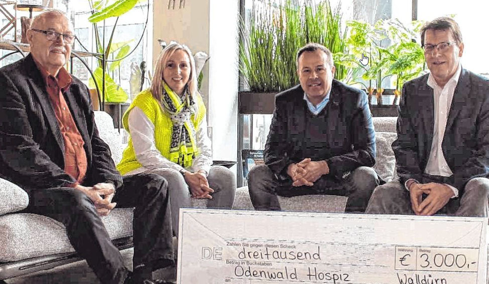 Die Spende wurde am Freitag von Wolfram Fitz und Thomas Nitschmann an die Hospiz-Geschäftsführerin Christine Lehner und Herbert Kilian, den Vorsitzenden des Odenwald Hospizvereins, übergeben.