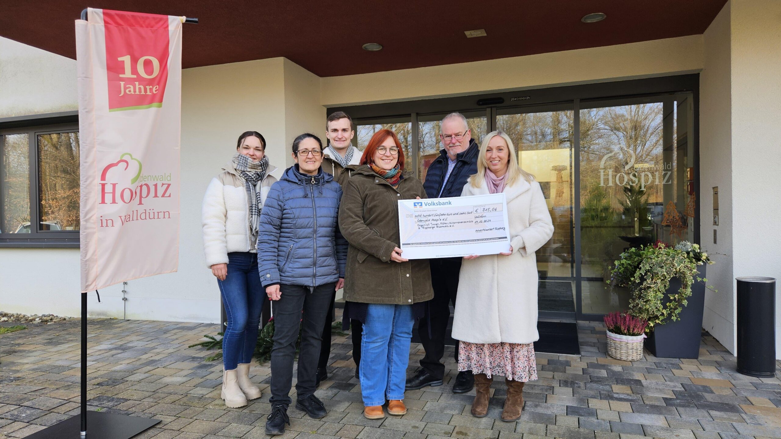 Andrea Seber (2.v.l.) vom Vorstandsteam der Rippberger Blasmusik übergab am Samstag mit stellvertretenden Akteuren des Rippberger Adventskonzerts zusammen einen Spendenscheck an die Geschäftsführerin des Odenwald Hospiz in Walldürn, Christine Lehner (rechts). Die Summe von über 800 Euro war der Erlös aus einem Konzert der Rippberger Blasmusik mit vielen weiteren Mitwirkenden am 1. Adventssonntag. Dabei war, statt eines Eintritts, um freiwillige Spende der Besucher gebeten worden. „Ein tolles Ergebnis“, lobte die Hospizleiterin die Überbringer und gab ihnen mit einer Führung durch die Räumlichkeiten der Einrichtung einen bewegenden Blick hinter die dortigen Kulissen.