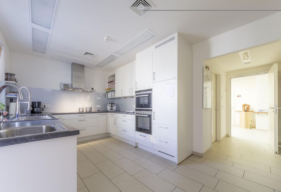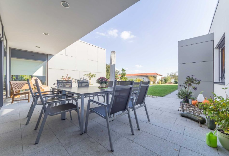 Ebenso wichtig wie die Zurückgezogenheit in den eigenen Bereich ist die Begegnung mit anderen Menschen. Das Wohnzimmer mit Kamin und Terrasse und die große Küche schaffen dafür einen geeigneten, beinahe familiären Rahmen.