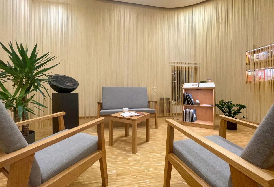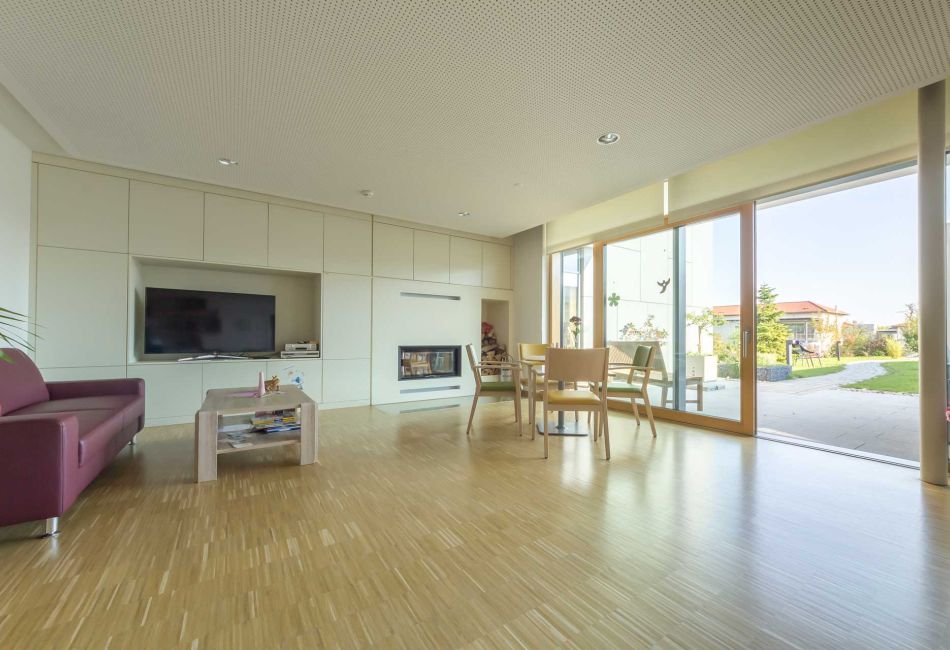 So wichtig, wie die Zurückgezogenheit im eigenen Zimmer, ist die Begegnung mit anderen Menschen. Diese kann im Wohnzimmer mit Kamin und Terrasse stattfinden und bietet einen geeigneten, beinahe familiären Rahmen.